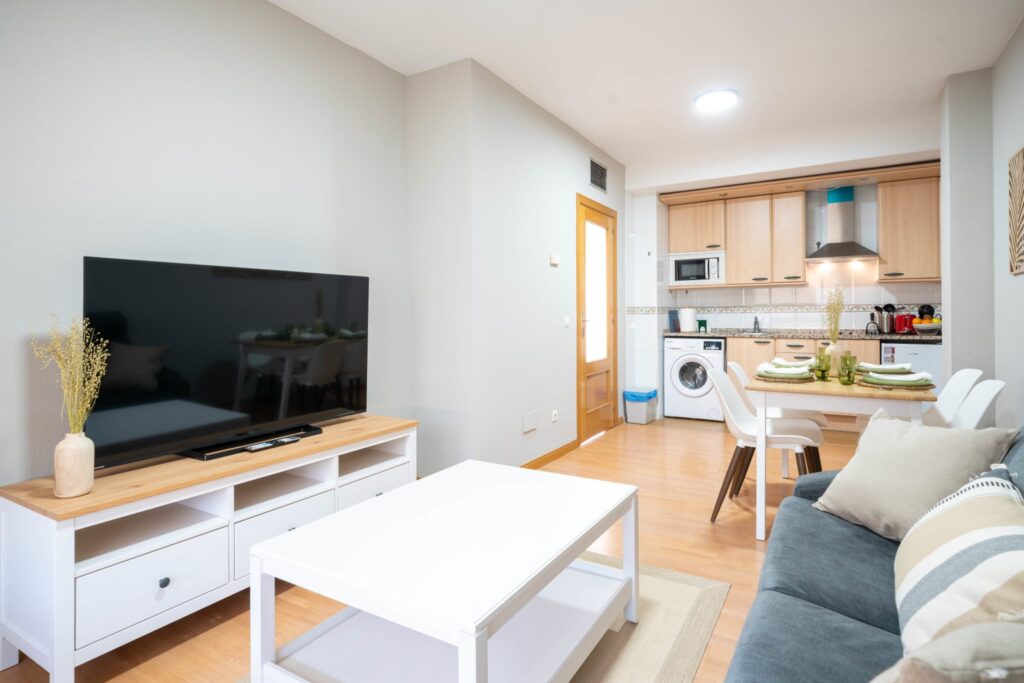 Dispone de un dormitorio con dos camas individuales de 0,90 m con TV, salón con TV y un sofá cama salón de 1,40 m , cocina americana equipada, aire acondicionado, Wi-Fi, ascensor, parking, lavadora, cafetera, ropa de cama y toallas.